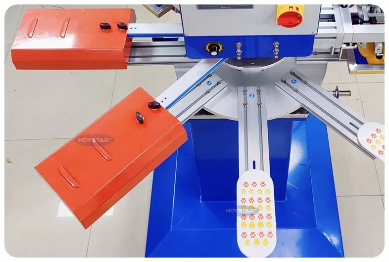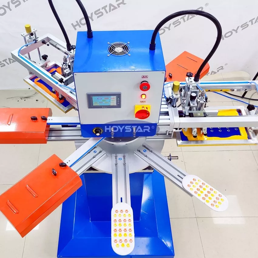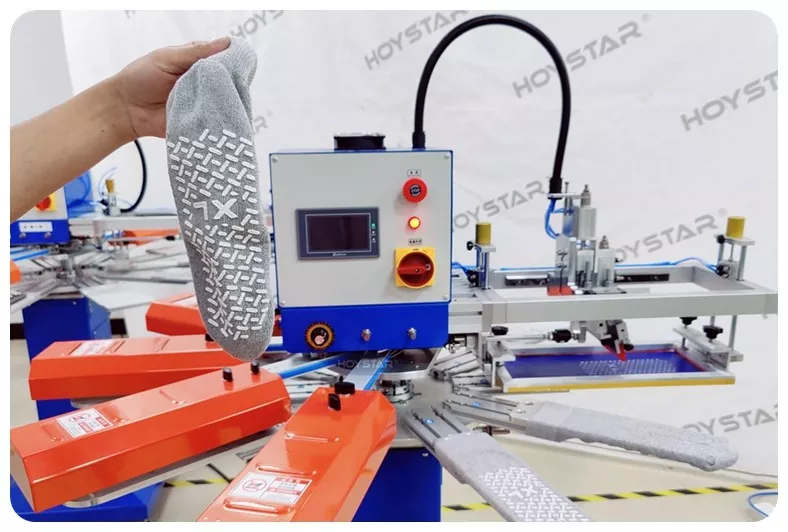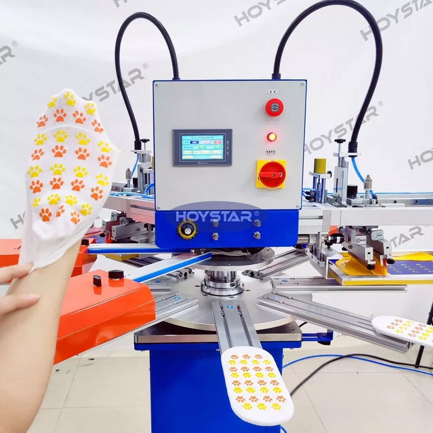 Како професионален производител во Кина, би сакале да ви обезбедиме машина за печатење на екран со чорапи со голема брзина HOYSTAR 2 бои. Нашите машини прифаќаат PLC и контрола на екран на допир и главно се користат за печатење на различни видови чорапи. Машината може да печати на табаните и петите на чорапите и е опремена со рерна за сушење што може добро да ги исуши силициумот и мастилото.
