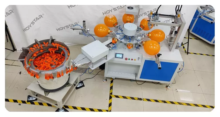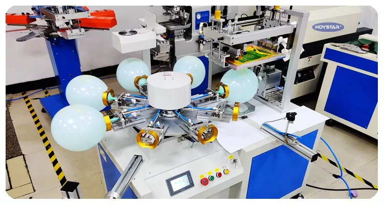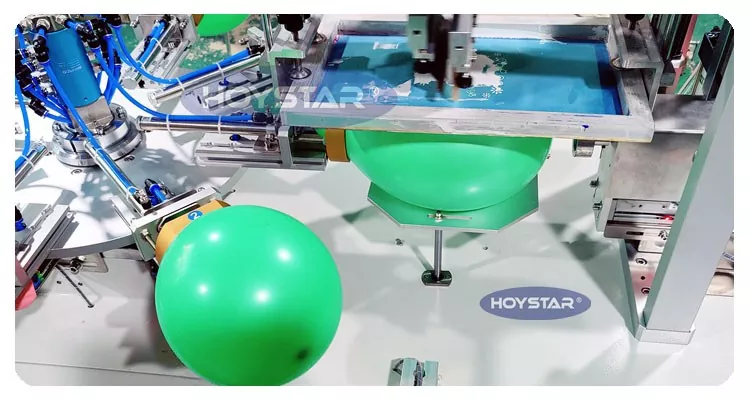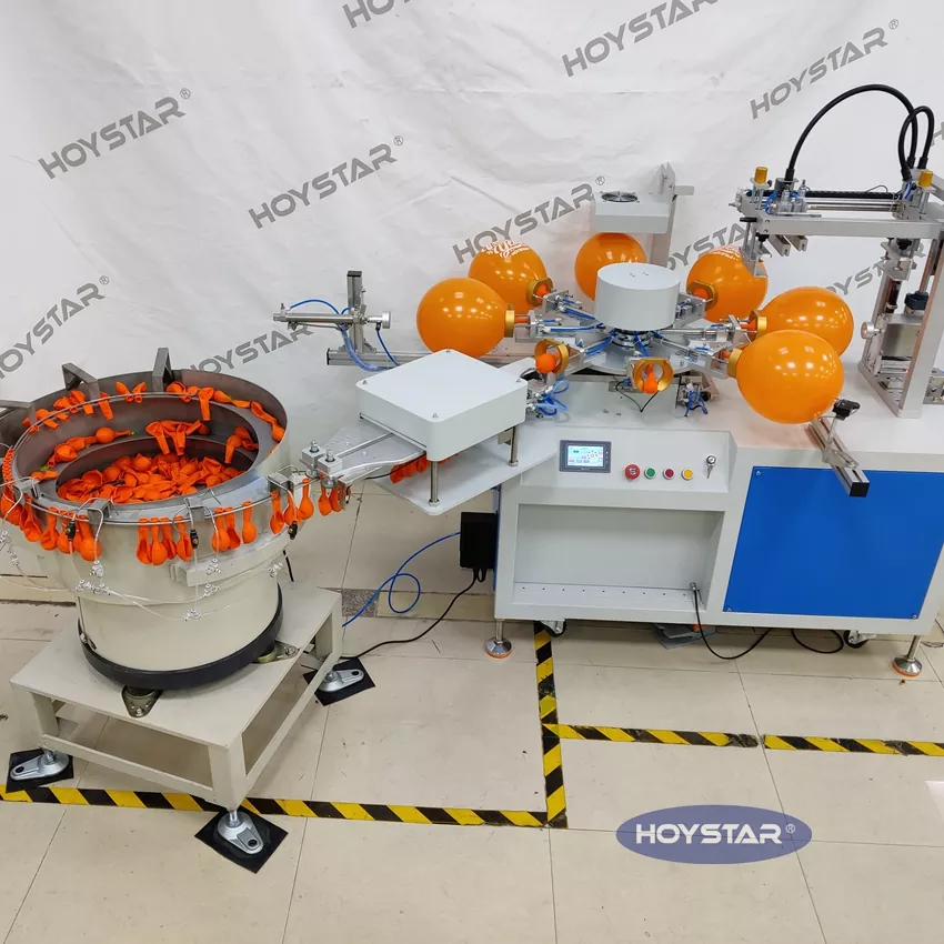 Како професионален производител и добавувач, HOYSTAR целосна автоматска машина за печатење со екран со балони во 1 боја.  е дизајниран за печатење на латекс балони. Опремен со ротациона работна маса, автоматско полнење, автоматско дување, автоматско ротирање, автоматско сушење, функции за автоматско растоварување. Контрола на екран на допир со PLC, интерфејс лесен за корисникот за безбедно, интуитивно работење. Машината комбинира брзина, прецизност и леснотија на користење.
