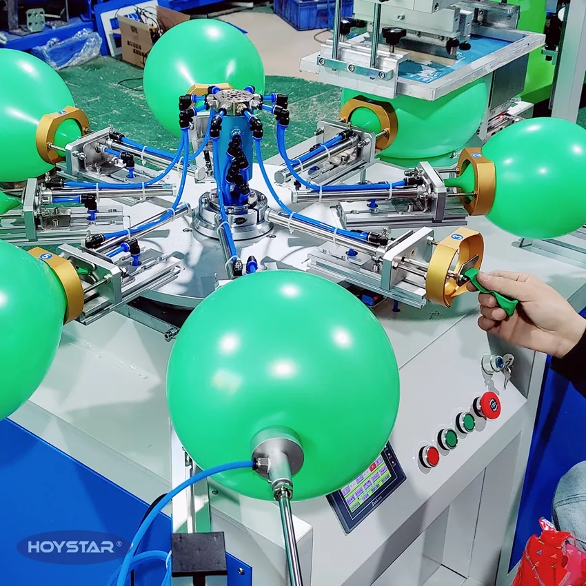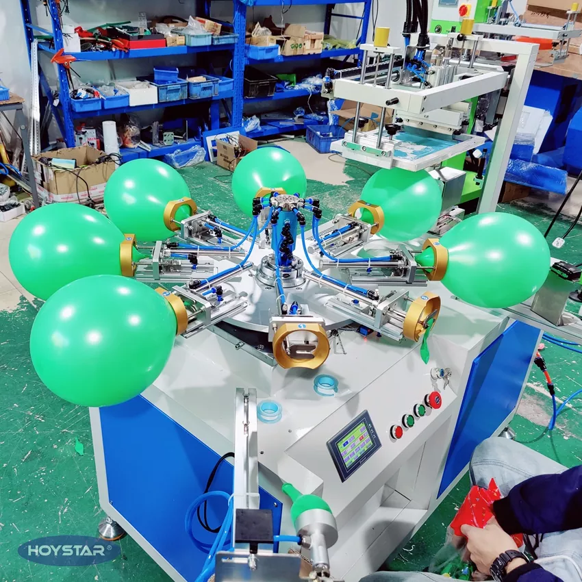 HOYSTAR е сигурен производител и снабдувач во Кина; Оваа машина за печатење со екран со латекс во една боја HOYSTAR е дизајнирана за печатење на латекс балони. Опремен со ротациона работна маса, автоматско дување, автоматско ротирање, автоматско сушење, функции за автоматско растоварување. Контрола на екран на допир со PLC, интерфејс лесен за корисникот за безбедно, интуитивно работење. Машината комбинира брзина, прецизност и леснотија на користење.